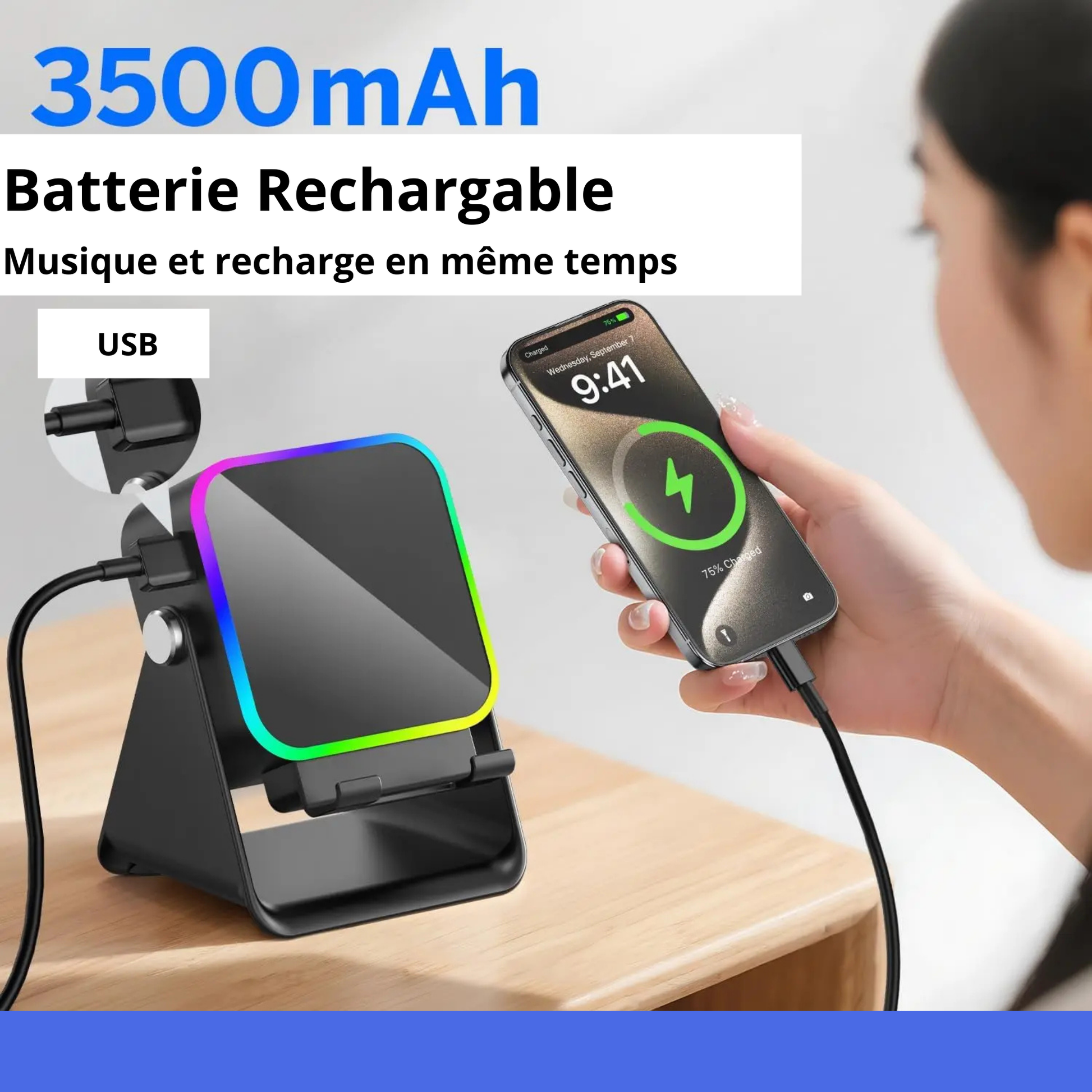 Batterie de 3500 mAh se recharge ultra rapidement en USB, avec une portée sans fil de 10 a 20 métres.